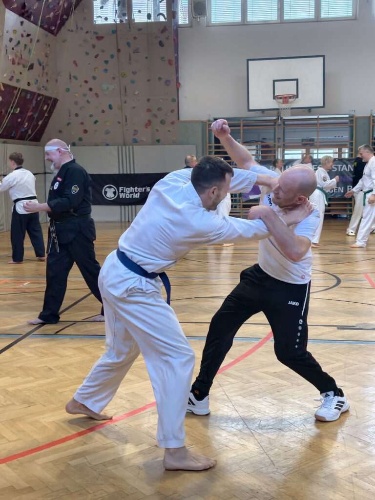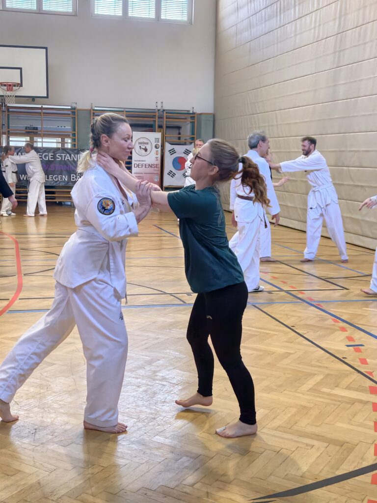 Besonders die Ausweich- und Konter Beispiele und der Einsatz von Alltagsgegenständen als Block-Waffe faszinierten die Teilnehmer!